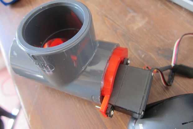 Atornillado el servo a la base del taladro, asegurándose que fue girado sin bamboleo y luego prueba montado en un pedazo de tubo plástico de pieza en T 1 1/2 pulgadas (comúnmente usada para tubería de la bañera de hidromasaje) - coste £2,90 fuera de ebay (tubo de PVC soldadura solvente - estanques caliente tinas etc.). Una vez era feliz gire sin atar fijó en lugar con pegamento caliente donde inserta en la tubería.