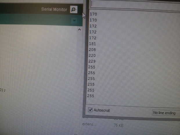 En el código (foto No.1) vemos el A0 (senespin) leer los valores, que nos aseguramos de que nuestros valores son entre 32 y 118 cualquier cosa superior a 118 serán 118 o nada inferior a 32 será 32 (estos son los valores que mi arduino Lee, si su rango es mayor o menor cambiar el código de acuerdo con ella).