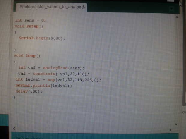 Después del comando "restringir" he usado el "mapa" uno, el comando cambia el 32 al 255 y 118 a 0, todo entre 118 y 32 escala de proporcionalidad entre 0 y 255 (aviso que como el nivel de luz es menor el fotoresistor salidas más corriente el val es menor y el ledval consigue más arriba y al contrario).