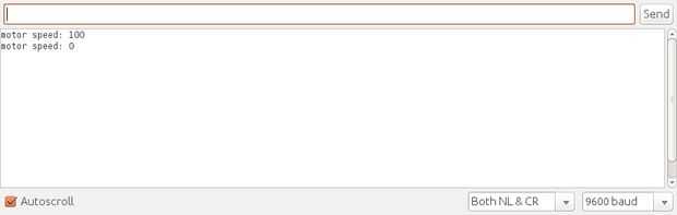 Abra el ide de arduino conectar la placa a continuación, abra el monitor serie. IMPORTANTE: Elegir "Ambos NL & CR" como la línea final de lo contrario los valores no se leerán. Introduzca algunos valores en el serial monitor y pulsar intro te debe ser capaz de controlar la velocidad del motor.