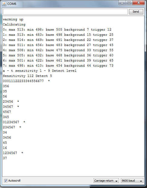El bosquejo de huecas y abra al monitor serie, retorno de 9600. Mientras que huecas es el calentamiento y calibración, mantenga las manos lejos de Arduino. Después de completa la calibración se muestran los datos de calibración, ajuste de sensibilidad y niveles del disparador. Cuando se toca el encabezado de plástico cerca de los pines analógicos se muestra el perfil del toque. La sensibilidad puede ser ajustado mediante la introducción de a-z o detectar nivel 1-9. Trate de r4 de alta sensibilidad y detección a distancia. Con d2 puede que necesite pellizcarse la cabecera entre los dedos para detectar.