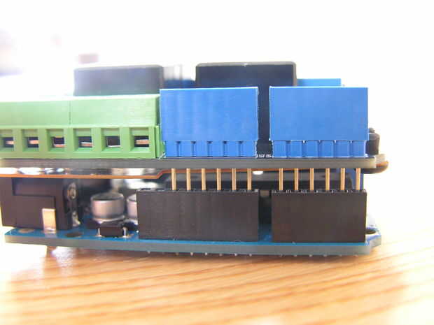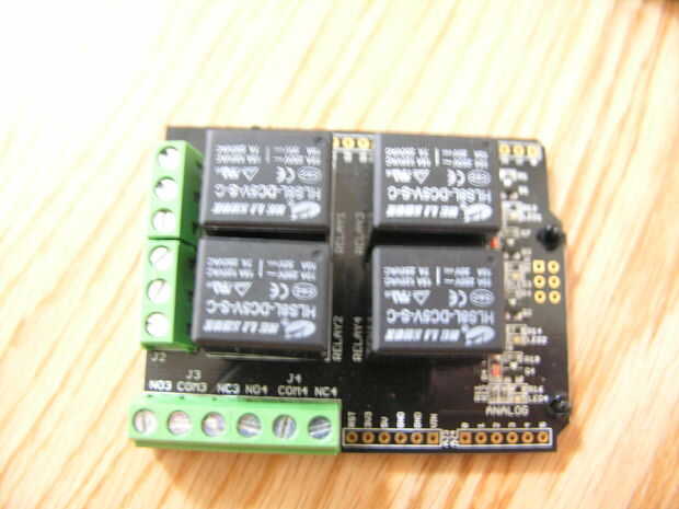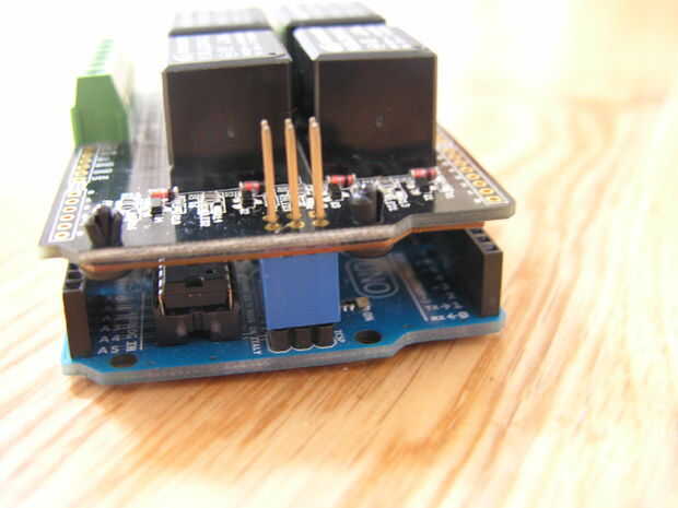 El Relais protector que purchesed consistió en la placas y pasadores y se sienta encima del Arduino. Esto significa que tenemos que tomar la salida de las clavijas conectadas a Arduino y recordar qué pines de puente fueron conectados a qué número de pines de Arduino.