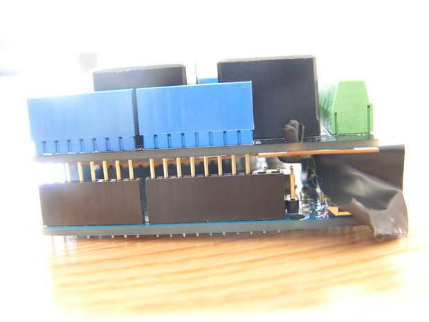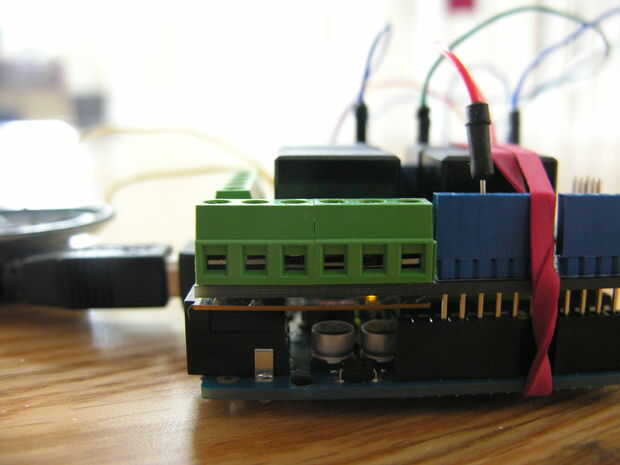 La conexión del relé con Arduino no era gran así que usé una banda elástica para mantenerlos juntos. Si usted tiene acceso a equipos de soldadura, puede soldar los encabezados de relé protector en el escudo de relé. Esto debería dar una mejor conexión.