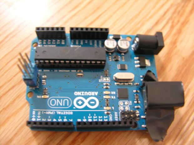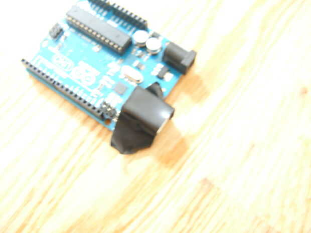Para asegurarse de que el escudo de relé no toque el puerto USB de Arduino, colocar unas tiras de cinta aislante para cubrirlo.