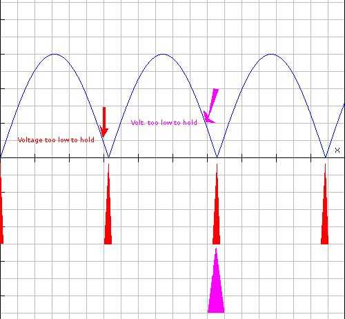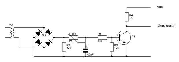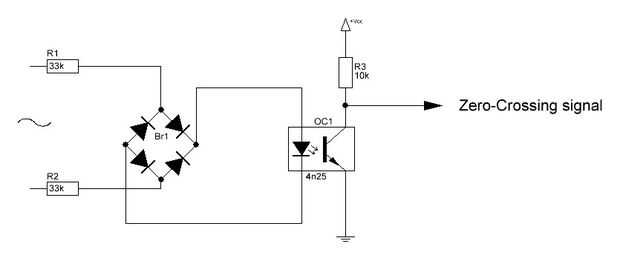 Este resultado de la rectificación en un voltaje DC pulsante que mantiene el optoacoplador abierto, manteniendo la zerocrossing señal baja hasta que el voltaje cae a 'cero' en qué momento el optoacoplador no estará en la señal de zerocrossing y conducción ya se tira alto, hasta que el voltaje se levanta otra vez suficiente para enviar el optoacoplador en conducción, dando como resultado el ir de pin de zerocrossing baja.
