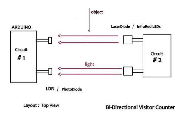 En posición normal, los rayos caen directamente en las LDRs y por lo tanto, la resistencia de las LDRs cae drásticamente. Como la resistencia cae por debajo de 10k ohmios, el pin analógico leerá un valor análogo más bajo. Cuando un objeto entra, rompe el primer beam (viga A) antes de segundo rayo (rayo B), el contador se incrementará en 1. Como B se rompe antes de la viga A la viga, el contador disminuirá en 1.
