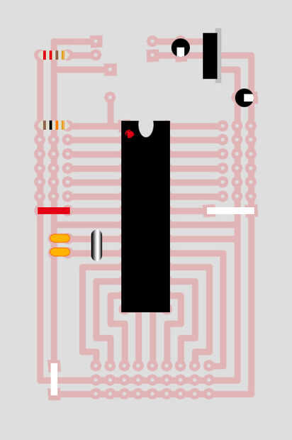 Agregar el cristal de 16mHz y los condensadores cerámicos de 22pf (2 de ellos).
