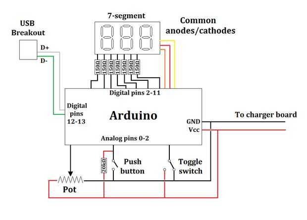 Conectar los LEDs de 7 segmentos a través de una resistencia de 150 Ohm cada a algunos pines digitales del Arduino. Lo mismo para los ánodos comunes (o cátodos).