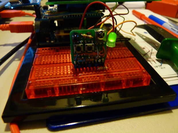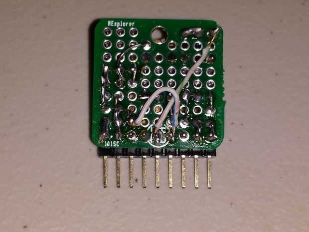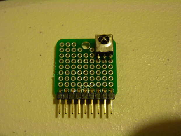 Este fue el primer escudo mini. Tenía algunas piezas que quería añadir a mi escudo de tiempo y temperatura, pero no tenía más espacio en el escudo para las partes. He decidido ponerlos en una placa hija con pasadores de encabezado por lo que es desprendible y reutilizable. Tuve algunas de estas tarjetas de proto agujero 9 x 9 no encontré un uso para el que resultó de 9 hoyos fue exactamente el tamaño correcto para este proyecto.