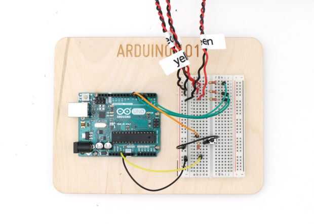 A continuación, coge una resistencia, el mismo valor exacto que las utilizadas en el último paso (rojo, rojo marrón = 220 ohmios) y conecte un extremo de la misma fila que el botón y el cable que viene del pin 6 y el otro extremo en la misma fila que el cable amarillo desde el pin de 5V de Arduino, en la imagen este es el más bajo.