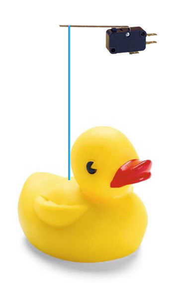 He elegido un enfoque muy simple. Tengo un pato de goma flotando en el agua. Pato tiene una cadena unida que opera un microinterruptor que se cierne sobre la parte superior del contenedor. Si el agua va hacia abajo, así que va hasta ducky tira del interruptor. Que el interruptor es leído por el Arduino que desconecta la bomba y envía una señal a la alarma.