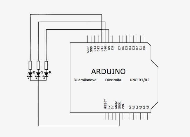 Los LEDs RGB que estamos usando en esta clase son cátodo común, lo que significa todos los tres LEDs comparten el mismo conector de tierra (algunos LEDs RGB, llamado ánodo común, compartir un pin de fuente común y tienen motivos diferentes). A alambre nuestro circuito como la primera imagen de arriba, cada LED en el LED RGB tiene una resistencia de 220 ohmios en serie con él que está conectada a que un PWM habilitado pin Arduino (utilicé pernos de 9-11). Esta manera, nosotros podemos selectivamente cada LED en el LED RGB encender y apagar individualmente.