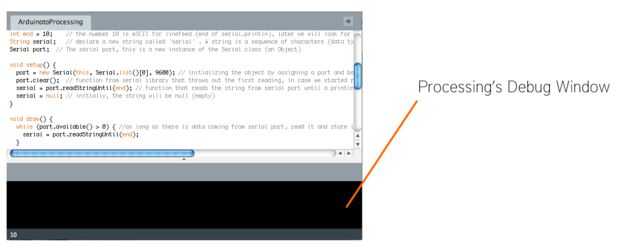 Cuando haya terminado modificar el bosquejo (si lo necesita), ejecutar el programa con el botón Play y leer los valores en la ventana de depuración del proceso. Estos valores, que se almacenan en las células de la matriz, ahora pueden utilizarse en el proceso de bocetos.