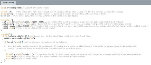 Esto crea un nuevo objeto (que es una instancia de una clase - el bloque de edificio fundamental de programación orientada a objetos, o "Programación orientada a objetos"). El segundo argumento de la función de Serial.list() es el Puerto entrante que se utiliza por su Arduino. Mayoría de los usuarios probablemente puede usar el puerto predeterminado [0], pero esto puede necesitar ser cambiado si está utilizando un puerto diferente. El tercer argumento es la velocidad que debe coincidir con la tasa de baudios utilizada en la función de Serial.begin() de su sketch de Arduino.