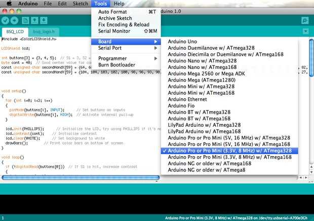 • Configurar Arduino para sus Arduino-Plaza Seleccione Herramientas -> tabla y seleccione "Arduino Pro o Pro Mini (3.3V, 8 Mhz) con ATmega 328"