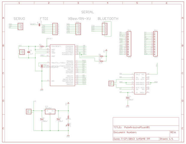 Diseñé la palma Arduino más que similar a una forma por lo que parece diferente de la Arduino V3 de la palma. La otra razón fue que quería eliminar el área sin usar por debajo de los dos 1 x 14 receptáculos hembra del PCB.