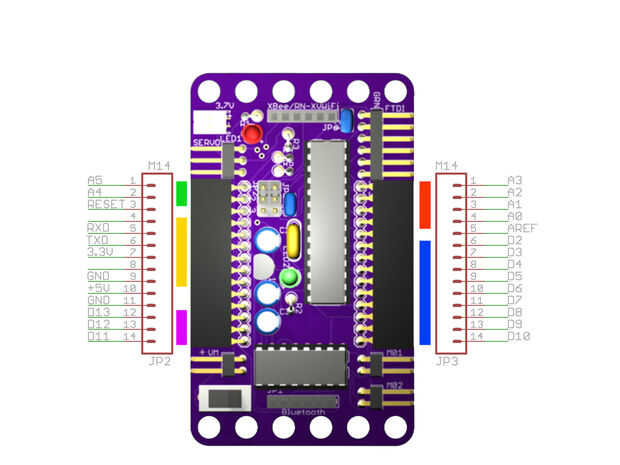 Grupo también los pines de comunicación serie (TX, RX, VCC, GND) en el riel para ser compatible con el XBee breakout Junta, como XB-Buddy Kit básico de Adafruit tablero de adaptador XBee (ID-126) y de Sparkfun Bluetooth Mate oro (WRL-09358), etc..