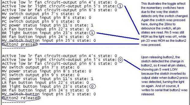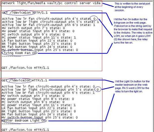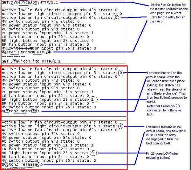 También llamo States() cada vez que una acción se toma basada en el aporte de la página web, lo que para una serio gran cantidad de salida serie. Era sobre todo solucionar algún comportamiento extraño que resultó ser causada por una superficie ligeramente conductora (parte superior del pecho antiguo manchado) donde ponen mi Arduino y el interruptor de circuito, aún sin un caso de proyecto. Necesito arreglar eso pronto pero por ahora, he puesto una hoja de papel debajo de todo. Antes de eso, pude colocar mi mano en la parte superior del pecho y un relé invertir los Estados. Resultados no deseables. Yo a recortar el uso pesado de States() o whiddle por su contenido pronto. También cerca de la parte superior de mi ' lista' es para terminar mi caja de plexiglás para la Arduino Mega ethernet escudo y hacer algo similar para el interruptor de circuito impreso.