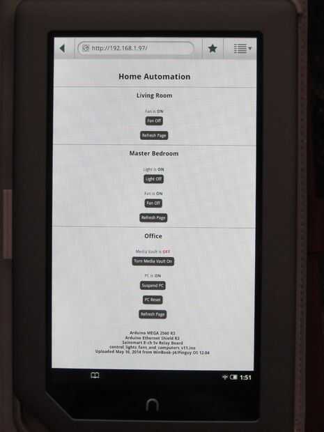 Me gustó la manera que esto trabajado lo suficiente como para volver atrás y modificar la luz y piezas de control de ventilador de techo de la página web para incluir este comportamiento condicional. Lo único que no me gusta acerca del uso de esto es que la página no es verdaderamente dinámica, lo que significa que no se actualiza después de hacer clic en un botón. Creo que sería necesario agregar AJAX o JSON que no he aprendido todavía. Me experimentar ampliamente con JavaScript normal y no era capaz de tener éxito. Entonces agregué botones de 'Actualizar' para cada sección que realmente no actualizar como haría el botón de refrescar del navegador, pero sólo enlazan a http://192.168.1.97/ para el Arduino devolver una página fresca sin el navegador envía cualquier cadena de encabezado adicional al final de la URL. Mis botones de pseudo-actualización no hará que el Arduino cambiar el estado de las patas. Si el explorador muestra http://192.168.1.97/?pcon, usando el botón de refrescar del navegador provocaría el navegador para volver a enviar que solicitar y hacer que mi PC a suspender. Esto es desde que estoy usando el interruptor de alimentación para interfaz con el Arduino y la misma acción se requiere para el interruptor Encender como apagar. Es una buena idea para evitar el uso de cualquiera de los botones de navegación del navegador en casos como este.