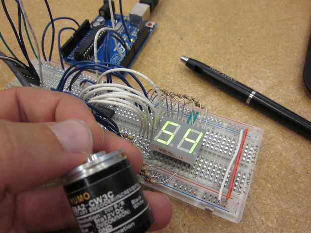 Cuando se ve una señal de levantamiento, activa la función de encoderPos. Esta función lee el número y añade o resta un intervalo en la posición. Nota: Sólo agregando y utilizando mod, podemos mejor controlar la gama de la posición, así la limitación de 0 a 99. Y la variable global debe ser identificada como una variable volátil para trabajar con interrupciones.