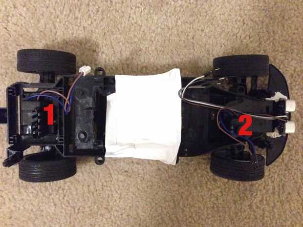 En la foto de arriba, puede ver (1) el motor de accionamiento de la rueda trasera y (2) el manejo motor de rueda delantera.