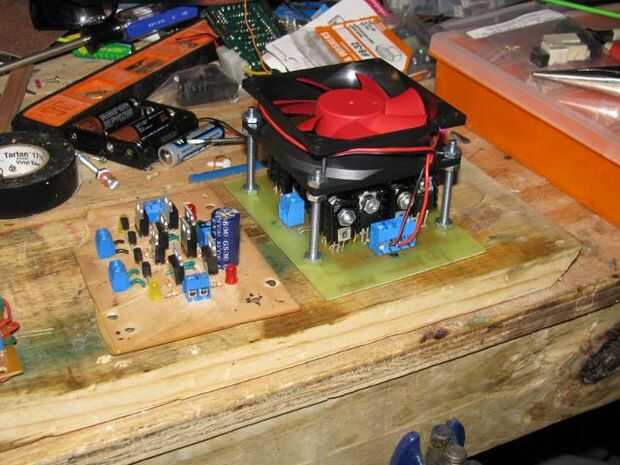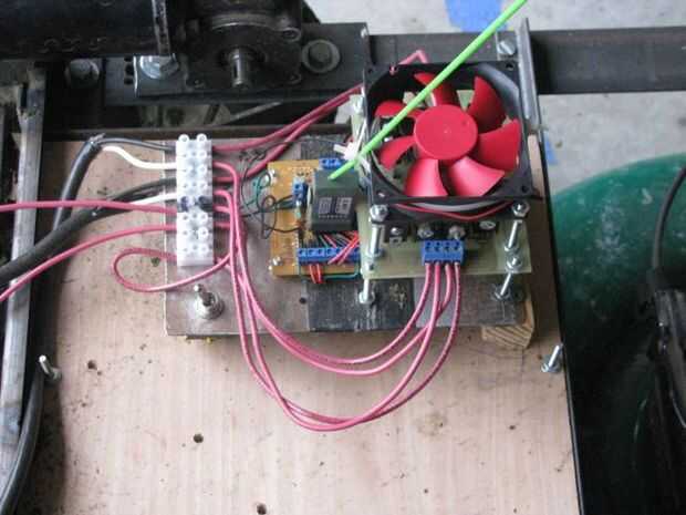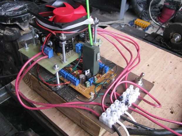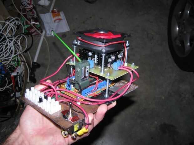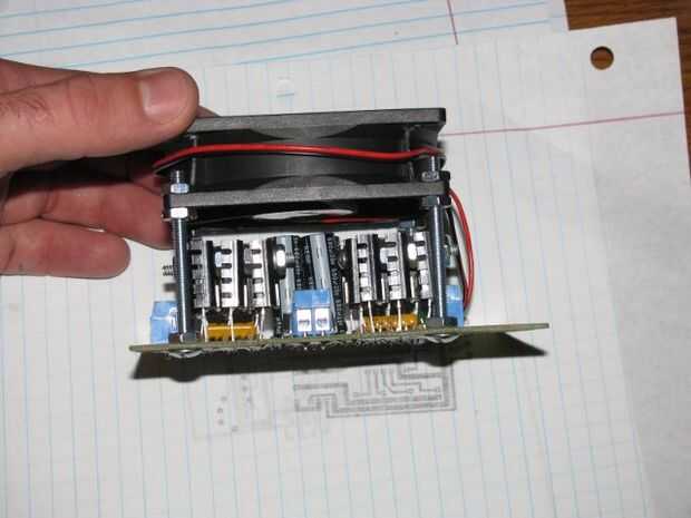El diseño es simple: P 2-channel MOSFET controla los interruptores del lado alto y 2 mosfets de canal N para los interruptores del lado de baja presión. Pero en lugar de utilizar 1 mosfet para cada interruptor, permite utilizar 3. Ahora tenemos 12 mosfets por puente en H (interruptores 3 mosfets x 4) y teóricamente la capacidad para transportar 150 amperios (que no es exacta). El tablero es tan pequeño como yo podría hacer con no tocar. Cada conjunto de 3 mosfets tienen disipadores de calor y se atornillan juntos para ayudar a disipar el calor. Además, hay un 80mm ventilador montado directamente arriba de mosfets para mantenerlos más frescos. Los mosfets son muy buenos en el manejo de cambios bruscos de dirección y cambios de velocidad.