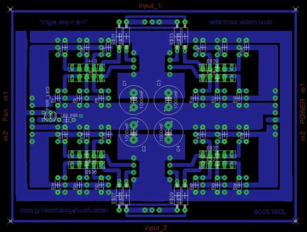 Si usted está interesado en construir su propio puente de H puede descargar el archivo de eagle para grabar un pcb y el esquema para mostrar donde todo va. Usted puede conseguir todo para hacer este puente h dual en Radio-shack (incluyendo el revestido de cobre), excepto los Mosfets y una red de resistencia especial que utiliza para ahorrar espacio. He comprado la mayoría de las piezas de Digikey pero porque era más barato y llega a mi casa en 2 días.