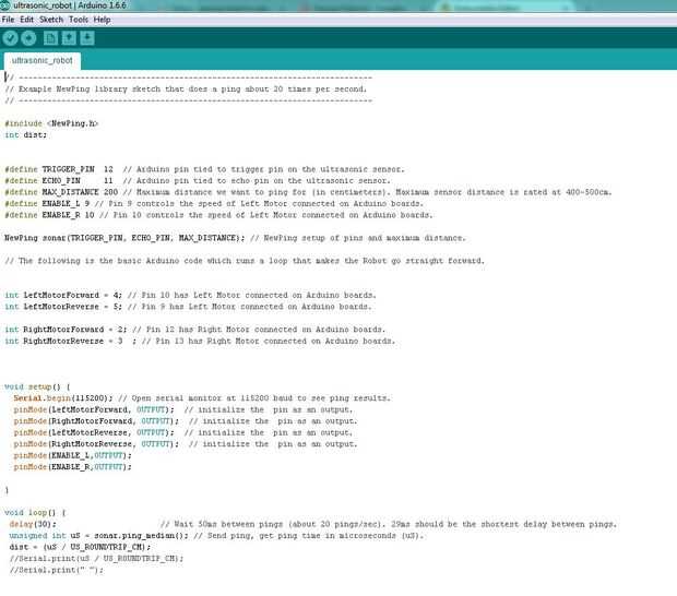 Puede comprobar la distancia que HC-SR04 medidas utilizando el puerto serie a 115200 baudios. Primero quitar el Vss (pin8 en L293D) cable para que el motor no funciona (y usted no tiene que mantener el robot en el aire)