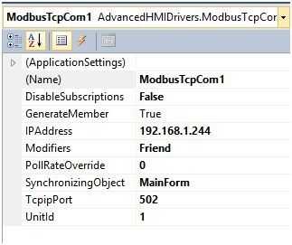 En AdvancedHMI recuerda que tienes que dar al conductor ModbusTcpCom1 la dirección IP de la pantalla de ethernet arduino 192.168.1.244 así en mi ejemplo.