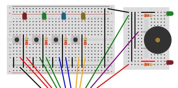 Comenzamos añadiendo 4 pulsadores y 4 resistencias de 4 LEDs, conectamos el cátodo de los LEDs con nuestros puntos en común y el ánodo con una resistencia. El otro extremo de la resistencia se conecta a un Pin Digital de Arduino. Hacemos algo similar para nuestros pulsadores; Conectamos nuestro Terminal 11 común y nuestro Terminal 21 con un Pin Digital de Arduino. También he añadido 2 más pequeños LEDs para darme una luz verde o roja cuando estoy bien o mal. Conecte sus piernas de cátodo a la tierra común y poner una resistencia en el lado del ánodo que conecta con los pines de Arduino. ¿Finalmente conecta el zumbador piezoeléctrico a nuestro Arduino del Pin 3, notar el pequeño ~ símbolo junto a la clavija 3 de tu arduino? Esto significa que el pin tiene capacidades de PWM, que necesitamos para crear un tono para nuestro Piezo. Puedes leer más sobre PWM aquí: Arduino.cc/PWM