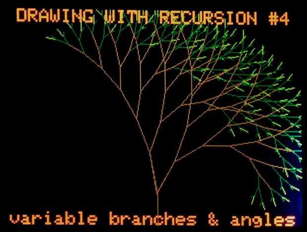 El principio es el mismo - pero en esta función podemos especificar longitudes de ramas izquierdas y derecha ramas y ángulo izquierdo, ángulo recto para las ramas. También se dibujan las ramas más cortas del final un color diferente. Nuestra tortuga está consiguiendo bastante artístico. Dependiendo de los valores utilizados, la imagen resultante puede ser sofisticada. Trate de alguna rama diferentes longitudes y colores y ver qué pasa.