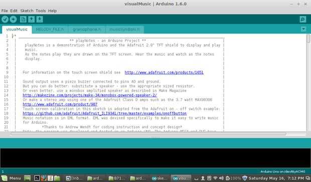 Los archivos de encabezado MELODY_FILE.h, musicSymbols.h y gramophone.h - se almacenan en las pestañas, que se abren en el IDE de Arduino.
