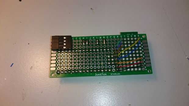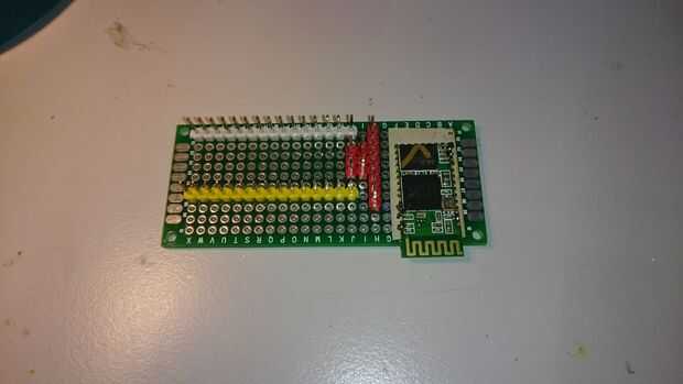 Ahora, coloque correctamente el HC-05 en su proto-board (preste atención, el HC-05 es espaciado de 1,5 mm, mientras que la placa es 2,45 mm distancia. Así, los agujeros no están alineados, pero con pocos cables adyacentes se puede gestionar pasar a través de)