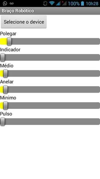 Enlace de Fiz este aplicativo para android neste: http://ai2.appinventor.mit.edu/ , onde cada barra comanda gradativamente o servo motor de cada dedo. Cada barra, de cada dedo, possui uma letra difere-un dos outros, por exemplo, o Dedao é a letra A, o Indicador é una letra B, etc., e después letra é enviado o numero do motor de PWM, por exemplo, A0550, A2200, B2200, etc.... e tudo isso é enviado hacer celular vía Bluetooth serial, sendo assim não tendo virgula entre um comando e outro, uma frase inteira, poe exemplo, A0550A0600A1000A2200B2200...