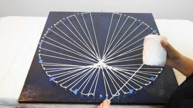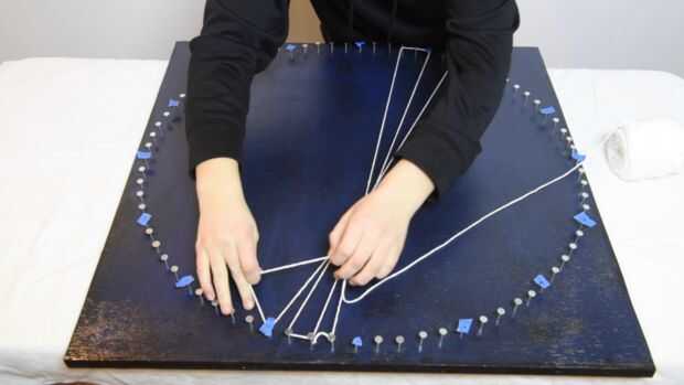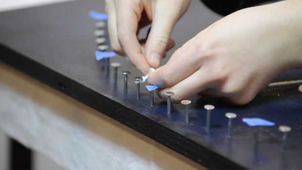 Empezar por atar el extremo de la cuerda al clavo número 2. A continuación hemos enumerado como la cadena va de clavo a clavo. En cada caso usted desea ejecutar la cadena a lo largo del borde exterior de la uña para la consistencia. Hay un patrón aquí, pero es mucho fácil de seguir el esquema y los números de abajo y después de unos pases, verás el patrón. Una cosa a destacar es el cambio en el golpeteo en el paso por debajo de 25. Asegúrese de que tomar nota de ello!