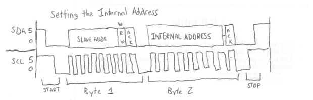 Como se mencionó anteriormente, antes de leer o escribir algún registro debe enviar la dirección interna del dispositivo, que se realiza mediante la realización de una operación de escritura de un byte, que contiene la dirección interna. Para las operaciones de escritura, la transmisión puede continuar con los valores de datos, el primero de los cuales se almacenará en la dirección deseada y cualquier bytes adicionales se incrementan hacia arriba por uno cada vez. Para Lee, el maestro envía una condición de parada, luego iniciar una nueva transmisión para la lectura. Esto es porque no se pueden tener una escritura y una lectura en la misma transmisión. En algunos casos, un comienzo repetido puede ser enviado en lugar de una parada y empezar. Un repetido de inicio es una transición de alto a bajo en SDA SCL es alto.
