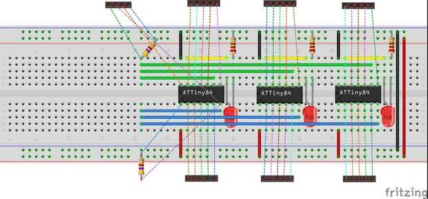 Los tres chips de ATTiny84 se fijan en la placa por lo que hay 5 agujeros separándolos y los pines Vcc y GND (1 y 14) se alinean con los agujeros del riel.