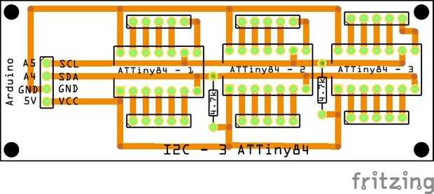 Así que, ahí lo tienen. Microprocesadores de tres ATTiny84 en un circuito de esclavo I2C, todo lo que queda ahora es programar estos pequeños campeones en más útil manera ;)