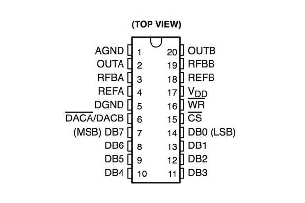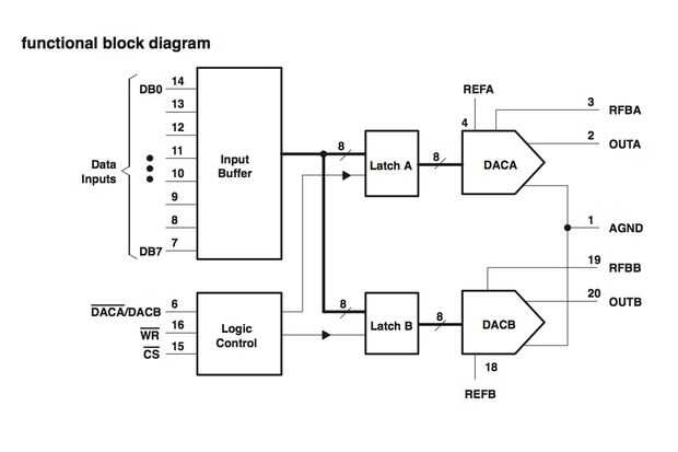 El diagrama de pines que se muestra arriba viene directamente de la hoja de datos de la DAC TLC7528. Como describí en el último paso, el TLC7528 tiene 8 entradas de datos paralelo, etiquetadas DB0-DB7; estos pernos se conectarán directamente a los pines digitales 0-7 de Arduino. El TLC7528 es un chip interesante porque realmente tiene dos salidas (llamado DACA y DACB), ambos conectados a los mismos pines de entrada digitales 8. Usted puede seleccionar que la salida que desea utilizar por el perno de ajuste 6 alta o baja (baja salidas salidas alta al DACB y DACA). Los pines 15 y 16 se utilizan para controlar las salidas de la DAC, así, voy a explicar más en pasos posteriores.