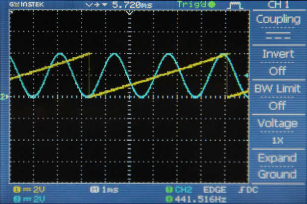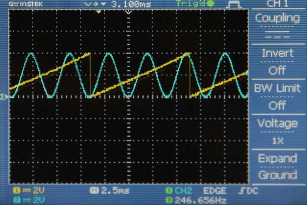 Cuando las interrupciones, los conjuntos de Arduino el WR perno alto, temporalmente tiene las salidas DAC en sus tensiones actuales y nos permite enviar datos en CAD sin necesidad de cambiar la salida DAC seleccionado actual. La variable "canal" alterna entre valores de 0 y 1 cada vez que la interrupción se ejecuta alternando el seno y salida de la sierra. Cuando el "canal" = 1, se establece un valor de la matriz "seno" a la DAC por PORTD. La siguiente línea establece el outputSelector pin (pin DACA/DACB) bajo, que DACA que se seleccionarán. Entonces WR se encuentra baja, causando el nuevo valor del seno a través de DACA. En la siguiente rutina de interrupción, una serie similar de eventos provoca un valor de sierra a la salida de la DACB.