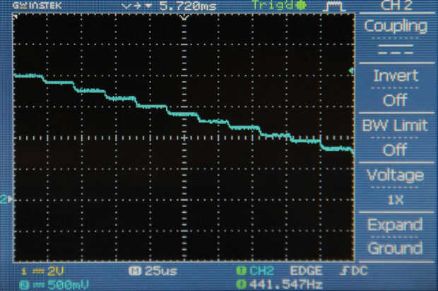 Configurar una interrupción como en el ultimo paso, pero esta vez la puse a una velocidad de 2 * 44.1 = 88,2 kHz. Entonces cada vez que la interrupción que se ejecuta, alternaba entre mandando algo a DACA y DACB, por lo que cada uno recibió una muestra durante cada interrupción de otros. Esto hace que la frecuencia de muestreo en ambas las salidas 44.1 kHz. El contenido de la rutina de interrupción se copia a continuación: