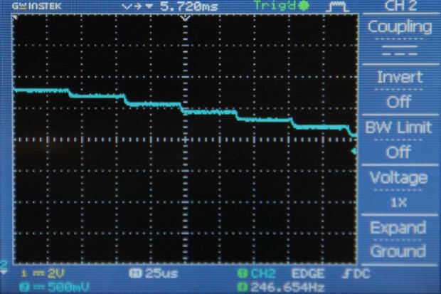 pero si observas higos 2 y 3 veremos en que la duración de la muestra y período de las ondas de salida es mucho más largo. Esto es porque el código en la rutina de interrupción es ineficiente y está tomando más de 22.6us para ejecutar. Para solucionarlo tuve que reemplazar el comando Arduino de la biblioteca "digitalWrite" con comandos de manipulación directa pin mucho más eficientes en el código siguiente. Puedes leer más sobre como funcionan aquí, también puede leer los comentarios me he puesto en el código siguiente. Higos 4 y 5 muestran las salidas de este código optimizado, se puede ver que la duración del período y muestra es lo que esperamos de los cálculos.