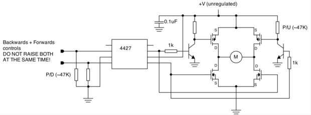 Aplicarán principios básicos de diseño de circuito: lo que se agrega debe ejecutar la misma alimentación que el resto del circuito (en realidad, mis controladores de motor utilizará parcialmente energía no regulada, pero comparten una tierra común). No debe generar ruido que interfiere con el MCU, no deben crear picos de gran voltaje que podrían destruir el MCU y debe interactuar con él en niveles de tensión de corriente que puede proporcionar el MCU (por lo tanto, no sólo el conductor 4427, una conexión directa a los MOSFETs).