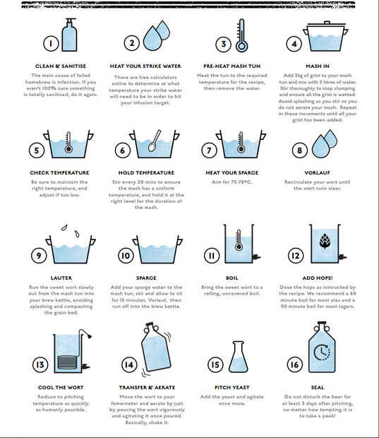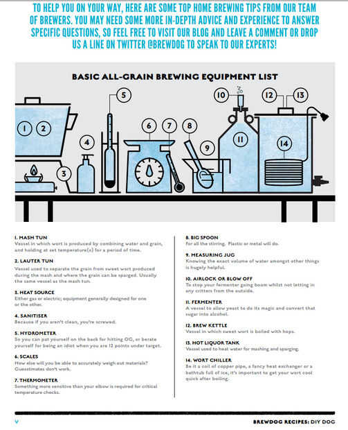 En esta parte voy a explicar como se hace cerveza y en qué consisten los distintos pasos del proceso de elaboración de la cerveza. Cerveza consta de cuatro ingridients cruciales: agua, granos, levadura y lúpulo. El proceso de convertir a éstas de una mezcla asqueroso en un christal claro cerveza divina es mucho más simple que usted puede pensar. A continuación se muestran los pasos básicos que atraviesa cada cerveza. Siga junto con el los gráficos frescos Brewdog libremente comparte con aspirantes a cerveceros (haga clic aquí para aprender más acerca de Brewdog y leer su maual completo llamado perro bricolaje - es impresionante). Si no entiende todos los términos al principio, no te preocupes. Sólo lee los pasos de nuevo y mirar el glosario que incluí en la foto 2.