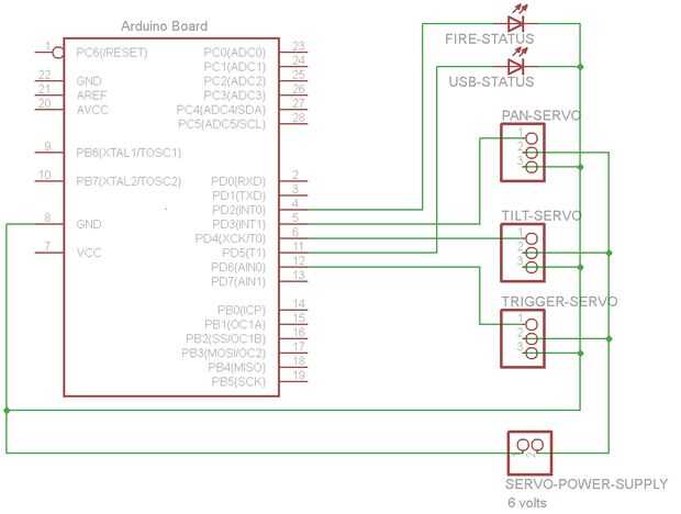 Los servomotores tienen tres hilos: alimentación, tierra y señal. Cable de alimentación de cada servo es típicamente rojo y debe estar conectado el (+) cable de la fuente de poder servo. El cable de tierra es normalmente negro o marrón y debe conectarse a un conector de tierra en la placa Arduino y el cable (-) de la fuente de energía. El cable de señal suele ser amarillo, naranja o blanco y debe estar conectado como sigue: cable de señal del servo de eje x va al pin de I/O digital de Arduino 3, el servo del eje y al pin 4 y el servo de disparo al pin 6.