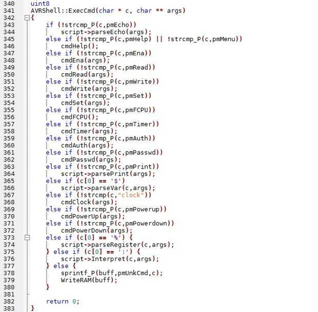 Decir que quería añadir un nuevo comando llamado "newcmd." Ir a AVRShell::ExecCmd y encontrar un lugar conveniente para insertar el siguiente código: