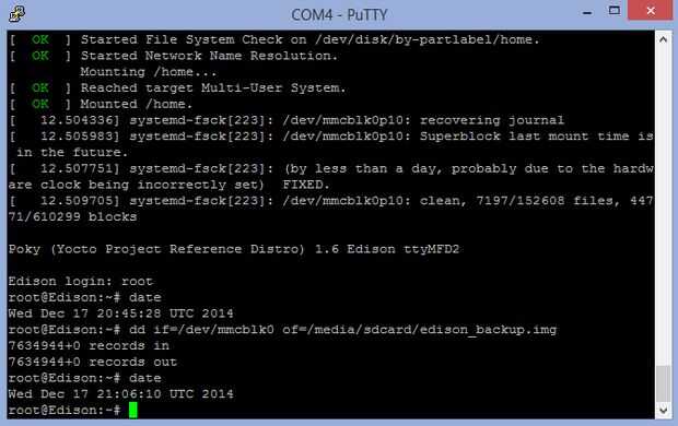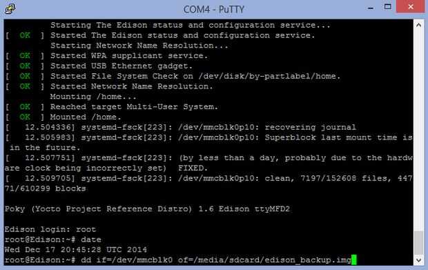 El comando: dd si = / dev/mmcblk0 of=/media/sdcard/edison_backup.img