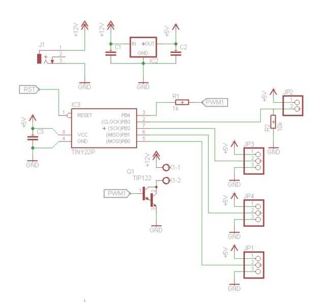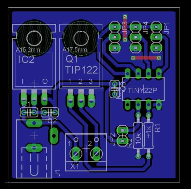 Porque quiero una solución más permanente que también hice un dibujo del pcb que utiliza un menor controller(attiny13/25/85) micro avr. Yo no he añadido una cabecera programación a la Junta (sólo programar en un protoboard y luego pegarlo en el pcb).