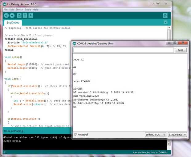 // EspDebug - Test sketch for ESP8266 module// emulate Serial1 if not present #ifndef HAVE_HWSERIAL1 #include "SoftwareSerial.h" SoftwareSerial Serial1(6, 7); // RX, TX #endif void setup() { Serial.begin(115200); // serial port used for debugging Serial1.begin(9600); // your ESP's baud rate might be different } void loop() { if(Serial1.available()) // check if the ESP is sending a message { while(Serial1.available()) { int c = Serial1.read(); // read the next character Serial.write((char)c); // writes data to the serial monitor } } if(Serial.available()) { // wait to let all the input command in the serial buffer delay(10); // read the input command in a string String cmd = ""; while(Serial.available()) { cmd += (char)Serial.read(); } // print the command and send it to the ESP Serial.println(); Serial.print(">>>> "); Serial.println(cmd); // send the read character to the ESP Serial1.print(cmd); } } Ahora puede abrir el monitor de Arduino serial (véase la captura de pantalla) y escriba basic algunos comandos AT.