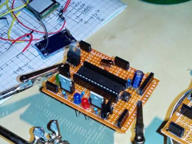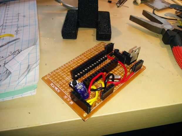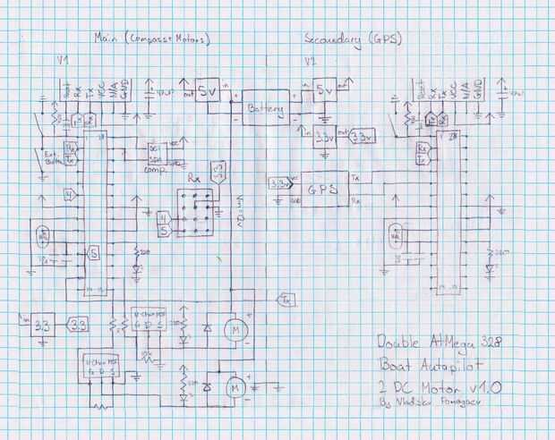 El circuito final era casi un duplicado del tercer prototipo, salvo que usé otro chip AtMega328 en vez de la Arduino Uno. Igualmente el anterior usted puede encontrar el diagrama del circuito completo. Puesto que había dos AtMegas, decidí dividirlas entre dos perfboards de 5x7cm que tenía puesta alrededor. El esquema se divide a lo largo, todo en uno y otro lado pertenece a su Consejo respectivo. Esto significa que hay dos reguladores de voltaje para cada tabla que dispersa el calor sobre un área superficial más grande. En lugar de soldar todas las piezas para el perfboard, soldado pin headers para piezas reemplazables como GPS, brújula, motores, FT232, AtMegas. También puse dos cabezales de perno a lo largo de cada AtMega por si quería añadir algo más en el futuro.